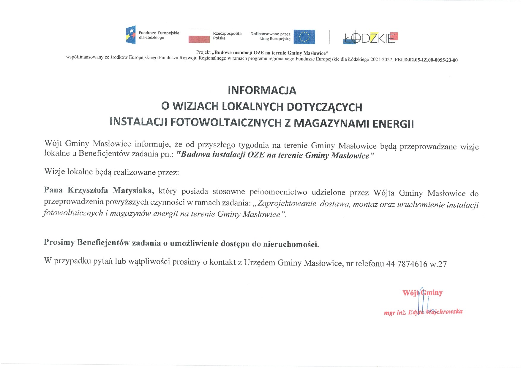 W dniu dzisiejszym Wójt Gminy Masłowice – Edyta Majchrowska podpisała umowę na realizację zamówienia pn. „Zaprojektowanie, dostawa, montaż oraz uruchomienie instalacji fotowoltaicznych i magazynów energii na terenie Gminy Masłowice”, realizowanego w ramach projektu „Budowa instalacji OZE na terenie Gminy Masłowice”.